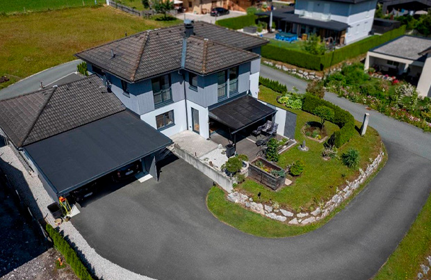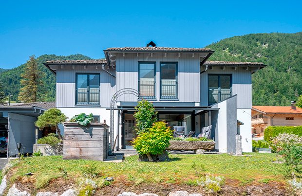 Der Kaminofen im Wohnbereich, kann zusätzlich zur Fußbodenheizung befeuert werden, und lädt besonders in der kalten Jahreszeit zum Verweilen ein. Von diesem Bereich des Erdgeschosses gelangen Sie in den stilsicheren angelegten großen Garten sowie Carport und einer weiteren Garage. Auf der Terrasse genießen Sie gemütliche Stunden im Freien und den Blick auf die Loferer Steinberge.