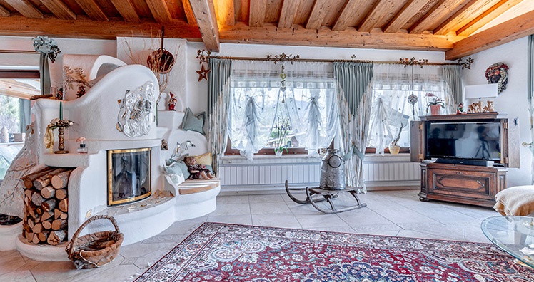 Die Wohnfläche im Erdgeschoß unterteilt sich in einen Wohn- und einen Schlafbereich und umfasst ca. 150 m². Der großzügig ausgelegte Wohnsalon überzeugt mit Panoramafenstern, die einen wunderbaren Blick auf die umliegende Bergwelt liefern, einer zur Region passenden Altholzdecke und einem außerordentlichen Kamin. Für die Böden im Wohntrakt wurden hochwertige Fliesen aus Italien importiert und in feinster Handwerkskunst verlegt. Vom Schlafzimmer sowie vom Wohnzimmer gelangen Sie auf überdachte Terrassenflächen und können den herrlichen Blick auf das Wilde Kaiser Gebirge genießen.
