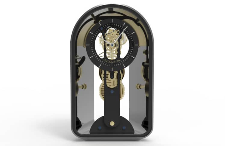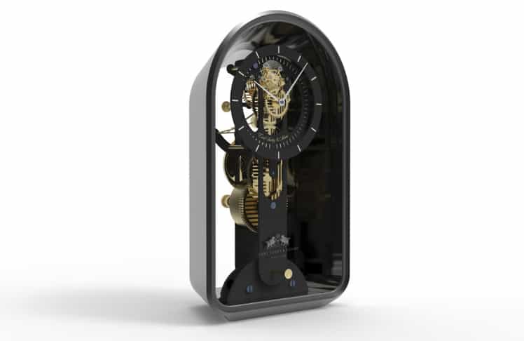 Das Gehäuse, aus einem einzigen Messingblock gefräst und mittels eines speziellen Vernickelungsverfahrens veredelt, verschmilzt in einer fließenden Passform mit dem Werk und verleiht der Tischuhr ihre schlichte Eleganz und kraftvolle Ausstrahlung.