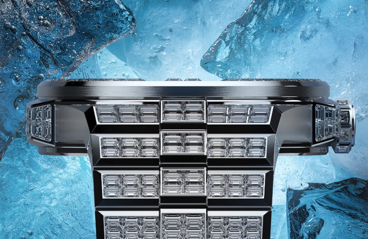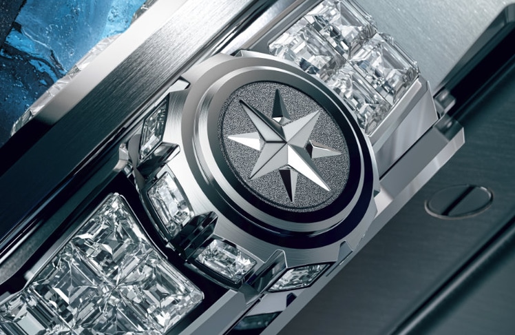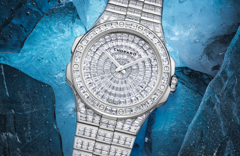 Mit der Alpine Eagle 41 XP Frozen Summit erweitert Chopard die moderne, sportlich-schicke Alpine Eagle Kollektion um eine Neuheit, in der sich die Kompetenzen des Hauses bei der Uhren- und Schmuckherstellung vereinen. Das 41 Millimeter große Gehäuse sowie das gesamte Zifferblatt, die Lünette, die Krone und das integrierte Armband in 18 Karat Ethischem Weißgold sind mit sorgsam geschliffenen Diamanten besetzt. Die Uhr erinnert an die himmlische Schönheit von Sternen, so die Beschreibung von Chopard, deren Glanz sich auf einem Gletscher spiegelt.