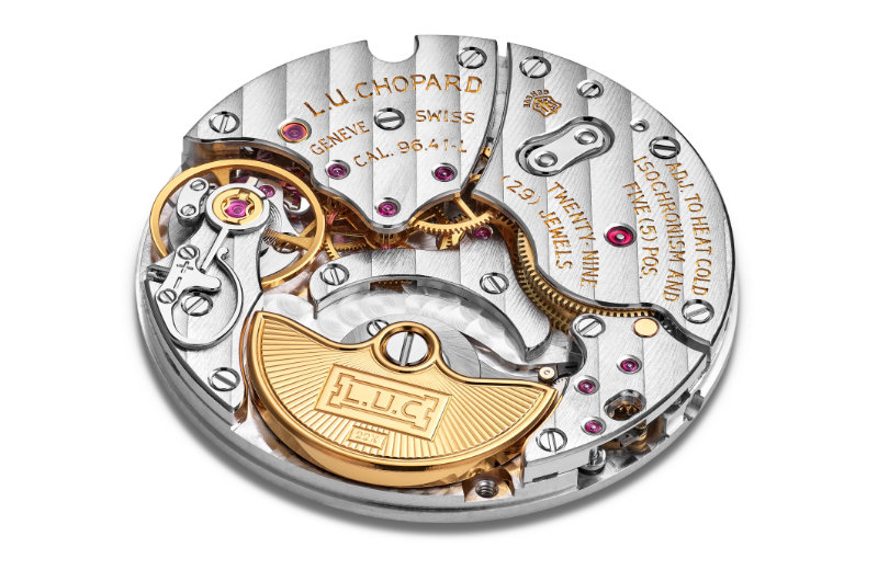 Das neue ultraflache Uhrwerk L.U.C 96.41- L ist eine Weiterentwicklung des ersten eigenen Kalibers, das die Manufaktur 1996 vorgestellt hat. Es verfügt über einen exzentrischen Mikrorotor in 22 Karat Gold, dessen hohes Trägheitsmoment für einen effektiven Aufzug der beiden Federhäuser sorgt. Diese sind gemäß der Chopard Twin Technologie übereinander gelagert und sorgen für eine Gangreserve von 65 Stunden. Dennoch misst das flache Uhrwerk in der Höhe lediglich 3,30 Millimeter. Eine weitere Besonderheit ist auch die Auszeichnung mit dem Qualitätssiegel Poinçon de Genève.