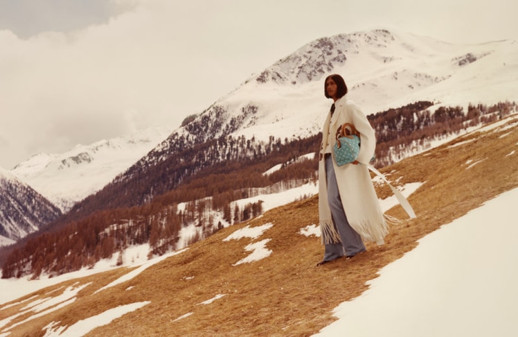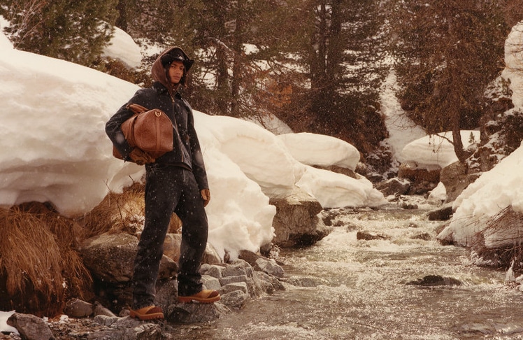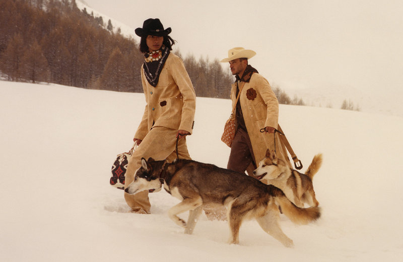 Die raffinierten Workwear-Silhouetten vereinen Strapazierfähigkeit und Eleganz in überfärbten Jacquard-Anzügen in eleganten Braun-, Schwarz- und Beigetönen. Charakteristische Sattel- und Lederapplikationen der Western-Garderobe zieren Taschen von Truckerjacken und Mänteln, die in skulpturalen, voluminösen Schnitten gehalten sind und den funktionalen Linien amerikanischer Arbeitskleidung treu bleiben.