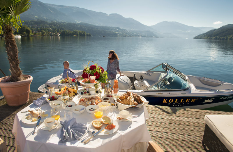 So besitzt die Familie Koller neben dem vorher erwähnten Oldtimerschiff noch ein zweites, ehemaliges Linienschiff, das zum Relax-Schiff "MS KOLLER Swan" umgebaut wurde. Weiters gibt es ein Motorboot für den Wasserskisport, das die Gäste aber auch zu einem "Dinner for 2" auf die Palmeninsel im See bringt. Für das Sieben-Gänge-Gourmetmenü wird jeder Gang frisch zubereitet und vom Butler per Boot serviert. Wahre Maritim-Urlauber sind in der Luxus-Bootshaus-Suite mit Yacht-Feeling untergebracht.