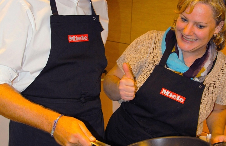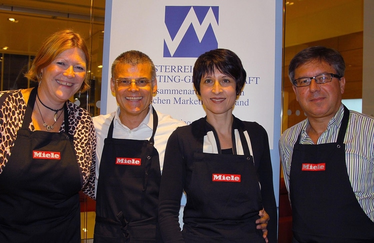 Rote Backen, konzentrierte Mienen, eifriges Schälen, Schnippeln, Kneten und Rühren. Die Mitglieder der Österreichischen Marketing-Gesellschaft (ÖMG) kochten auf Einladung der deutschen Edel-Marke Miele in der Vorarlberger Allee in Wien Inzersdorf auf. In der Miele Galerie wurden Edel-Dampfgarer, High-Tech Backrohre, Teppanyaki Grill und Induktionsherde gleich vor Ort ausprobiert. Dabei kam ein Vier-Gänge-Menü heraus, das nicht nur schonend gegart und deshalb besonders bekömmlich war, sondern den stolzen Köchen auch ausgezeichnet schmeckte.