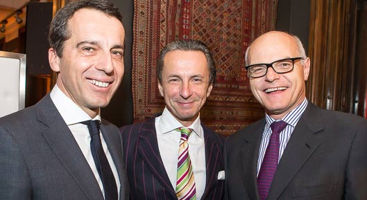 Wenn Christian Rainer, Herausgeber und Chefredakteur des Profil, zum Essen lädt, versammelt sich die nationale Wirtschaft. Wie stark die Zugkraft des Nachrichtenmagazins ist, bewies der Profil-Chef im Rahmen seiner Einladung zum "Editor's Dinner" ins noble Innenstadtpalais von Ali Rahimi. Gerade mal sechs Galatische waren für Österreichs Wirtschaftspromis gedeckt. Wer zur nationalen Wirtschaftselite gehören will, lässt sich diese Einladung nicht entgehen. Anett Hanck, CSO Verlagsgruppe News, ihr zu Seite Axel Bogocz und Helmut Hanusch, begrüßten gemeinsam mit dem Gastgeber die honorige Gästeschar und baten beinahe wie beim Opernball in eine Loge zum Netzwerken. Zur Freude von Ali Rahimi war die Loge sein Teppich-Verkaufsraum.