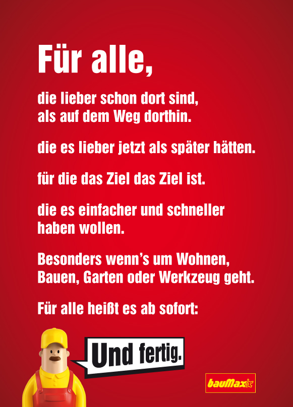 Aus diesem Grund wird der bauMax als Markenbotschafter des Unternehmens in Zukunft gemeinsam mit dem Claim „Und fertig.“ auftreten. Gezeigt werden „vollendete“ Heimwerkerprojekte und keine abschreckenden Baustellen.