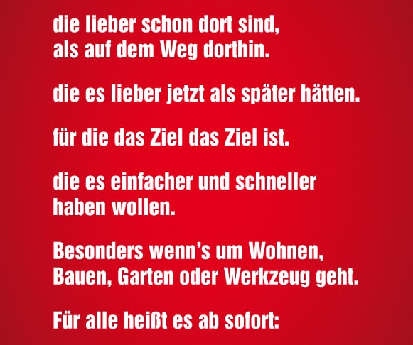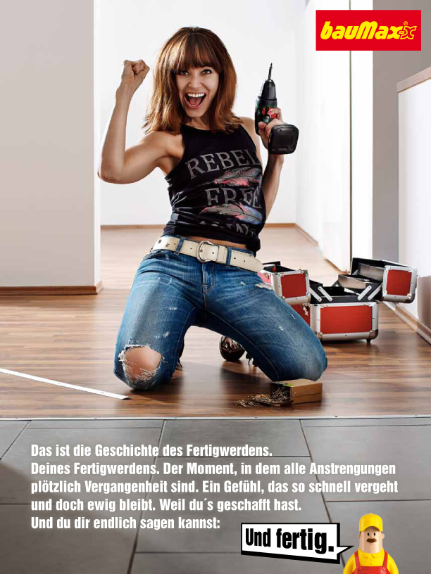 Im Zentrum aller Aussagen steht der „normale“ Heimwerker und dessen Freude, wenn er sein Heimwerkerprojekt erfolgreich abgeschlossen hat. bauMax rückt ab sofort das Fertigwerden in den Fokus und nicht das schweißtreibende Arbeiten. Denn wer kennt sie nicht, die langen Stunden beim Bodenlegen, beim Ausmalen oder Tapezieren. Die Arbeit dauert immer länger als gedacht, und dann, endlich ist es soweit, der letzte Handgriff ist geschafft und das Werk ist fertig.