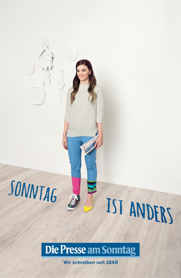 Dies wurde anlässlich des fünfjährigen Bestehens der Presse am Sonntag in einer neuen Imagekampagne umgesetzt: Die zwei Kernsujets der Kampagne zeigen jeweils einen Mann und eine Frau. Die Zweiteilung des Bildes hebt die Besonderheit des Sonntags hervor. Während die Wochenausgabe klassisch gehalten ist, gelten am Sonntag andere Regeln: Die bunte Kleidung der beiden Testimonials symbolisiert die Außergewöhnlichkeit der Presse am Sonntag. Eine umfassende Hintergrundrecherche, mehr Raum für Bilder und die Möglichkeit, Themen aus unterschiedlichen Blickwinkeln zu zeigen, charakterisieren die Sonntagsausgabe der Presse.