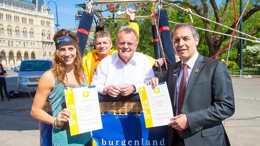 Mit einem „Urlaub mit Sonne drin“-Heißluftballon, gezielten Marketingmaßnahmen und einer Menge Events startet Burgenland Tourismus in die heurige Sommersaison. Vor der einzigartigen Kulisse des Wiener Rathauses wurde jetzt der neue Burgenland Werbe-Heißluftballon vor seiner ersten Fahrt von den beiden Präsidenten des Burgenland Tourismus, Landeshauptmann Hans Niessl und Landesrätin Michaela Resetar, sowie Olympiasiegerin Julia Dujmovits und ÖFB-Teamchef Marcel Koller auf dem Namen „Sunny“ getauft.