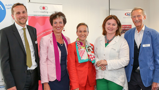 Das Podium war besetzt mit Diskutanten aus beiden Professionen: Unter der Moderation von Regina M. Jankowitsch sprachen PRVA-Vizepräsident Peter N. Thier, Organisationsberaterin Susanne Ehmer, Ketchum Publico-CEO Saskia Wallner und ACC-Präsidialmitglied Werner Vogelauer über ihre Erfahrungen und Ansichten. Schon bald kristallisierte sich eine klare Unterscheidung heraus: Coaching heißt fragen, um dem Prozess zu dienen, PR-Experte zu sein heißt, Antworten und konkrete Vorschläge anzubieten.