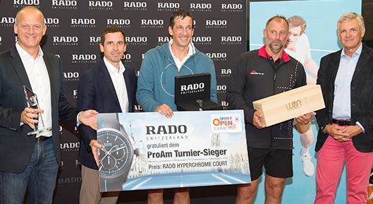 Erste Bank Open-Turnierdirektor Herwig Straka, Colony Club-Geschäftsführer Johannes Graski und Rado Brandmanager Peter Gauss übergaben die Siegesuhr, die speziell dem Tennis gewidmet ist, an Viktor Gernot. „Ich habe lauter ehemalige Pros an meiner Seite gehabt. Das war ein bisschen wie ein Kindergeburtstag für mich – und gewonnen habe ich auch noch“, so der Sieger. Den zweiten Platz sicherte sich Philipp Newald von tipp3. Julian Rachlin ging auch nicht leer aus und bekam als Ehrenpreis ein Dress, unterschrieben von Nick Bollettieri und seinem Idol Thomas Muster, verliehen