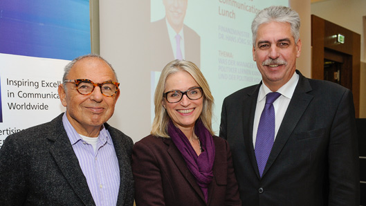 Finanzminister Hans Jörg Schelling war der prominente Gast beim fünften Business Communication Lunch der International Advertising Association (IAA). „Politiker und Manager können beide voneinander lernen“, so der Finanzminister in seinem Vortrag. „Während die Wirtschaft lösungsorientiert ist, ist die Politik prozessorientiert. Wenn in Unternehmen Probleme anstehen, werden sie analysiert, eine Lösung gesucht und diese umgesetzt. In der Politik hat man aber in der Regel nicht die Möglichkeit, alleine zu entscheiden, und muss Koalitionen bilden.“ Außerdem sei in der Wirtschaft das Tempo höher und der Stil ein anderer. „'Structure follows Strategy' ist nicht unbedingt das Prinzip der Politik. Politik muss lernen, dass Lösungen klare Ziele, klare Zeitpläne, klare Prozesse, Nutzenkommunikation und Leadership brauchen“, forderte Schelling. „Wir brauchen Politik für den Menschen und wenn es um unangenehme Wahrheiten geht, so muss man diese erklären.“