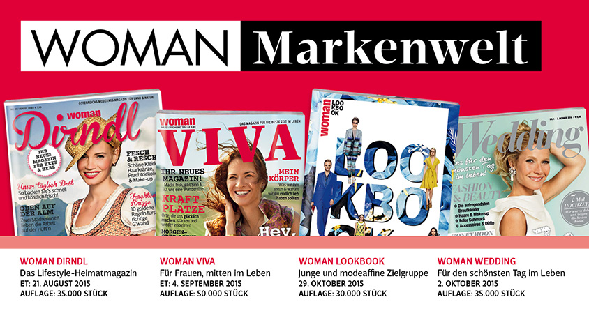 WOMAN - Frauenmedienmarke Nr. 1 in Österreich - richtet neue Kaufmagazine bereits seit einigen Jahren nach weiblichen Lebensphasen und gesellschaftlichen Trends aus und trifft damit den Nerv der Zeit. Vor allem boomende Trendbereiche wie Ernährung & Fitness, Nachhaltigkeit, Mode, Hochzeit, Landleben & Tradition und Entschleunigung finden eine starke und begeisterte Leserschaft bei Frauen unterschiedlichen Alters.