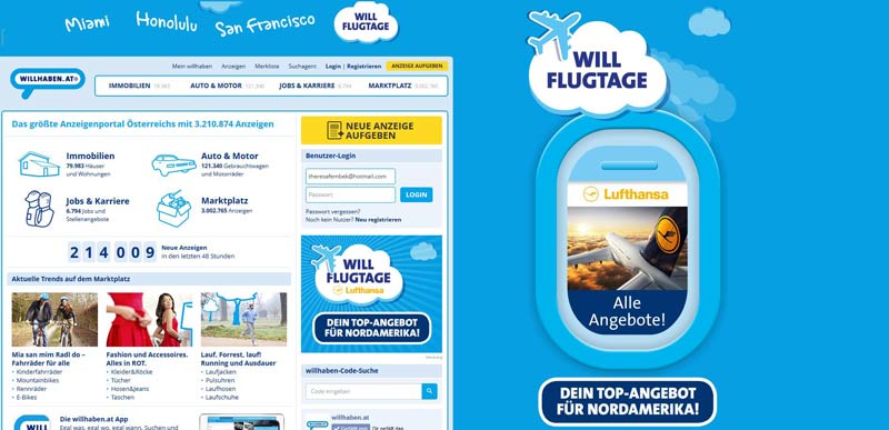 Das Digital Advertising Team von willhaben.at hat ein besonderes Werbeformat für die deutsche Fluggesellschaft Lufthansa entwickelt. Die „willhaben.at Flugtage" – so der Name des Projekts – treiben den Ticketverkauf an und gehen gemeinsam mit der Lufthansa gezielt auf die Besonderheiten und Bedürfnisse der Reisebranche und den reiseinteressierten Usern ein. Das Werbeformat überzeugt auf Desktop als Fullsite-Branding und funktioniert auch mobil.