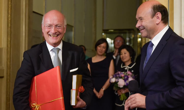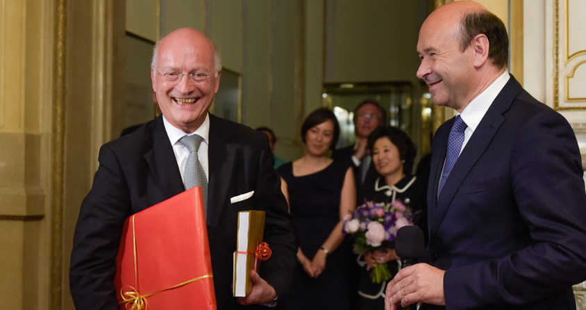 Bei der anschließenden Feier im Schwindfoyer verlas und übergab Bundestheater-Geschäftsführer Christian Kircher einen Dankesbrief von Kulturminister Thomas Drozda, Meyer überreichte Prof. Küchl zwei Geschenke: ein dickes Büchlein mit allen Premieren-Abendzetteln seiner "Amtszeit" sowie ein Foto der Staatsoper aus Perspektive des Konzertmeisterpultes.