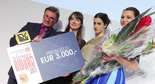 Bereits zum achten Mal wurde der "Ringstrassen-Galerien Designer Award" vergeben. Die Jury, bestehend aus Model Patricia Kaiser, Uschi Fellner - Herausgeberin Madonna/Österreich, Adi Weiss -Herausgeber Style Up your Life, Monika Kycelt - Direktorin Modeschule Hetzendorf, Stylistin Sabine Landl, Yasmin Hirth - Fashion TV, Simone Arlits von der österreichischen Textilzeitung, sowie dem Vorjahressieger Jürgen Bertsch, hat nach den Kriterien "Umsetzung des Themas", "Qualität", "Stoffauswahl" und "Verarbeitung" die Kreationen der Finalisten bewertet. Das Designer-Duo "Richter|Switala" ging als Gewinner hervor und durfte das Preisgeld von 3000 Euro mit nach Berlin nehmen.
