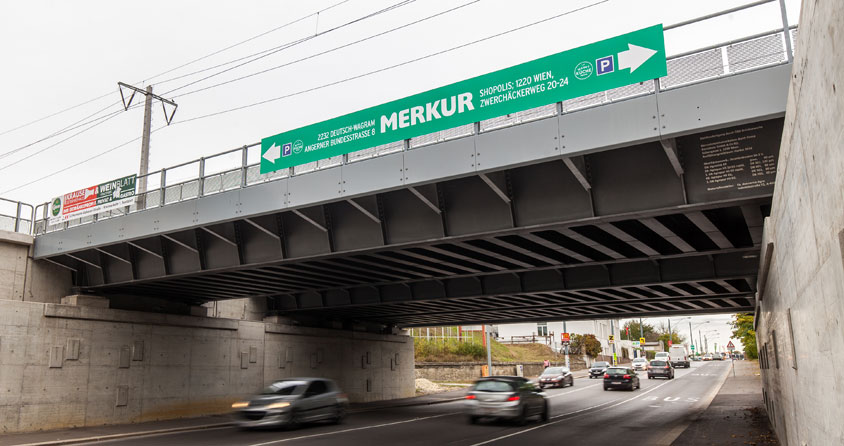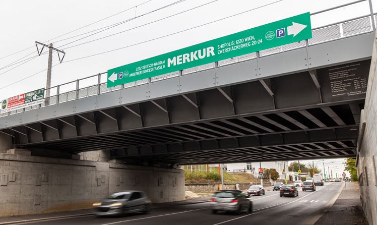 Die Supermarktkette Merkur betreibt über 130 Märkte in Österreich und gilt als Marktführer im Verbrauchermarkt-Segment. Um seine Kunden auf dem kürzesten und schnellstmöglichen Weg in eine der Filialen zu bekommen, setzt das Unternehmen auf eine auf den ersten Blick recht unspektakuläre, aber bei genauerem Hinsehen äußerst effektive Marketingmaßnahme: „Brückenwerbung“.