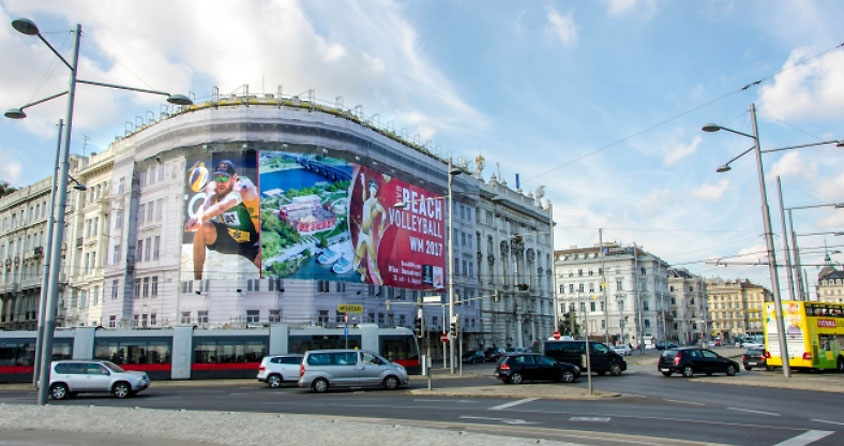 Der Schwarzenbergplatz ist einer der bekanntesten und höchst frequentiertesten Plätze im Wiener Stadtzentrum und DER innerstädtische Verkehrsknotenpunkt mit den bemerkenswertesten Bauwerken. An einem der historisch wertvollen Palais, angrenzend an die Französische Botschaft und gegenüber dem Haus der Industrie (Heumarkt), befindet sich die ca. 460 m² große Werbefläche, eingebettet in einen schönen Fassadenspiegel. Vor dem Megaposter queren auch die Straßenbahnlinien 71 (Rennweg) und D (Prinz-Eugen-Str. / Hauptbahnhof). Als „First-Mover“ an diesem Top-Standort präsentiert die Beach Majors GmbH ihr Sujet zur Bewerbung der, erstmals in Wien ausgetragenen, Beachvolleyball WM 2017. Die Wahl dieses Standortes, sowie die frühzeitige Bewerbung des Events an diesem exklusiven, geschichtsträchtigen und vor allem internationalen „Hot-Spot“, der sich in unmittelbarer Umgebung von Botschaften, Industrie und Wirtschaft befindet, hat Symbolcharakter und zeigt die Relevanz das das Event für die gesamte Stadt einnimmt.
