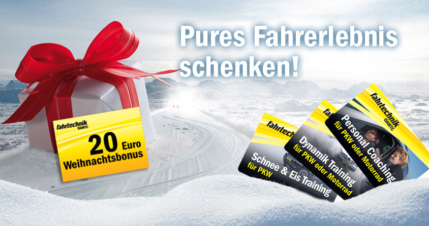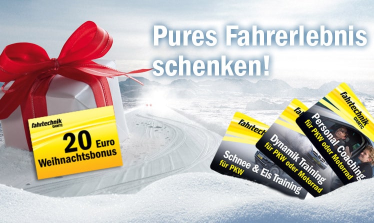 Rechtzeitig vor Weihnachten gibt es auf viele Produkte den € 20 X-MAS Bonus noch dazu! Ob Führerscheinneuling, Vielfahrer oder zum Kennenlernen des neuen Fahrzeugs und dessen Assistenzsysteme – ein Fahrtechnik Training ist garantiert das passende Geschenk für Weihnachten.