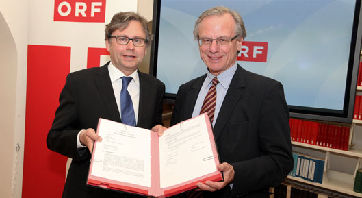 Georg Winckler, Rektor der Universität Wien, und ORF-Generaldirektor Alexander Wrabetz eröffneten das ORF-Fernseharchiv in Kooperation mit der Universität Wien feierlich. Erstmals gibt es für Studierende, sowie Wissenschafter der Universität Wien Zugriff auf alle seit 1955 archivierten Fernsehsendungen. Das sind mehr als 500.000 Programmstunden und mehr als 5,5 Millionen Dokumente. Bei der Eröffnung selbstverständlich ebenfalls mit dabei: Der Vorstand des Instituts für Zeitgeschichte,Oliver Rathkolb, und Herbert Hayduck, Chef des Fernseharchivs.