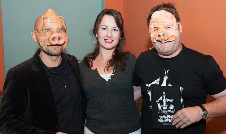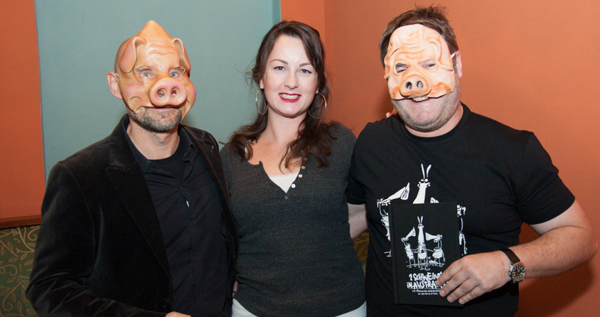 Wenn sich zwei testosterongesteuerte und trinkfreudige Provinz-Intellektuelle mit Schweinemasken und allerlei skurrilen Allüren zu einem Roadtrip entlang der Ostküste Australiens aufmachen sind groteske Abenteuer und Chaos vorprogrammiert: Kompromisslos, ordinär, sexistisch und politisch völlig unkorrekt sind die satirischen Reisetagebücher von den Autoren Joe S. Nuts und Jo Piccol ein saukomischer Lesespaß für Mann und Frau. Bei der offiziellen Lesung und Signierstunde im Schikaneder-Kino konnten die Gäste das brandneue Buch, mit Illustrationen von Bernd Püribauer, in einer exklusiven Hardcover-Sonderedition noch vor dem offiziellen Verkaufsstart erwerben. Beim gemütlichen Get-Together danach, konnten alle Interessierten noch mit australischem Freibier und Wein auf die neue Lektüre antossen.
