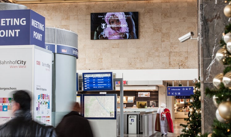 Eine Patenschaft für ein bedürftiges Kind kann dessen Leben retten und entscheidend verbessern. Darauf macht die Hilfsorganisation „Rettet das Kind“ im Zuge einer Kampagne auf heimischen Bahnhöfen aufmerksam. Die Organisation nutzt die Digital Screens der ÖBB Werbung für die Aktion „Geben Sie einem Kind eine Chance“.