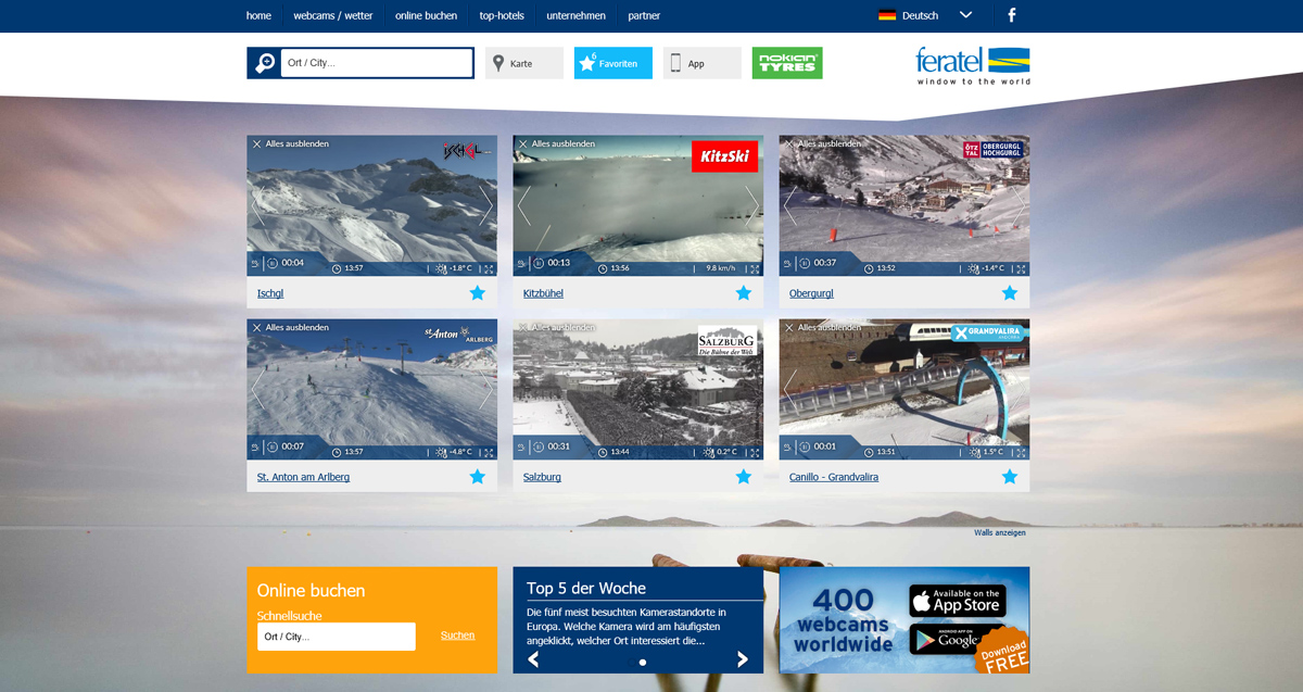 Insgesamt 400 Webcams in 14 Ländern informieren über die aktuelle Wettersituation am Berg, im Tal, in der Stadt und am Strand. Winter wie Sommer, live und in HD Qualität. Jeder zweite Besucher stammt aus Deutschland, gefolgt von Österreichern, Schweizern, Tschechen, Holländern, Belgiern, Italienern, Engländern, Slowaken und Spaniern. Insbesondere für Freizeitsportler, Outdoorbegeisterte und Urlauber spielt das Thema Wetter eine zentrale Rolle bei ihrer Entscheidung für eine bestimmte Destination. In Zeiten der Livekommunikation sind Bewegtbilder das A und O jeder erfolgreichen Destinationswebseite. Der Gast von heute wünscht sich authentische Berichte, der Gast von morgen setzt diese bereits voraus.