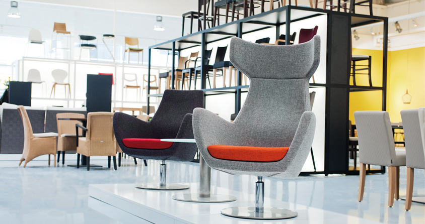 Die Hauptanliegen des neuen Showrooms sind Übersichtlichkeit und Orientierung in der großen Vielfalt des GO IN Produktportfolios. Basis des innovativen GO IN Ausstellungs-Konzept ist die Ganzheitlichkeit. Die Kojen Retro, Brauhaus, Lounge & Bar, High Dining, Designerstühle (für Seminar & Co) zeigen mehr als die puren Produkte. Kunden können die Themenwelten betreten, darin Platz nehmen und sich optimal in die Stilrichtungen hineinfühlen. Jeder Koje ist eine passende Farbe zugeordnet. Wohnaccessoires wie Lampen, Vorhänge, Teppiche und Dekoration sowie die Wandgestaltung runden den Gesamteindruck ab.