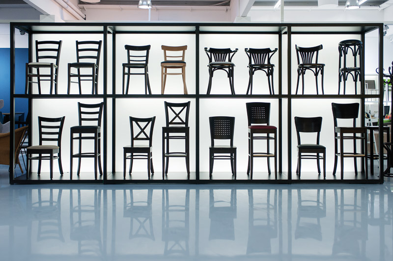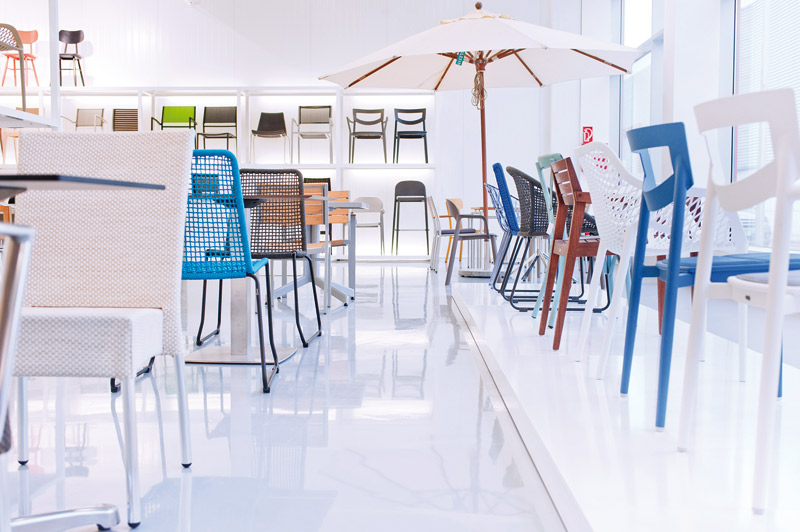 Ergänzt wird die Gastronomie-Erlebniswelt von den Neuheiten und Klassikern aus dem Gesamtprogramm des Profimöbel-Spezialisten. Die großzügige Ausstellungsfläche wird durch Podeste gegliedert, auf denen – angelehnt an die Gestaltung der Themenwelten – weitere Produkte für den Innen- und Außenbereich zu sehen sind. Auch sie sind nach Einrichtungsbereich und Stilrichtung gruppiert.