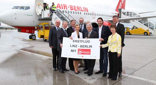 airberlin hat am 1. Juni 2011 die neue Linienflugverbindung Berlin - Linz - Berlin aufgenommen. Die Maschine wurde von Matthias von Randow, Bevollmächtigter des Vorstands airberlin, Dipl.-Ing. Gerhard Kunesch, Geschäftsführer Flughafen Linz GesmbH und zahlreichen Spitzenvertretern aus Politik, Tourismus und Wirtschaft wie besipielsweise Manfred Grubauer - Vorsitzender Tourismusverband Linz, Jürgen Dupper - Oberbürgermeister Passau, Franz Dobusch - Bürgermeister von Linz, Ulrike Rabmer-Koller - Vizepräsidentin Wirtschaftskammer OÖ, Landeshauptmann Josef Pühringer, Andreas Scheuer - Parlamentarischer Staatssekretär und Matthias von Randow - Bevollmächtigter des Vorstands airberlin am Flughafen Linz herzlich empfangen.