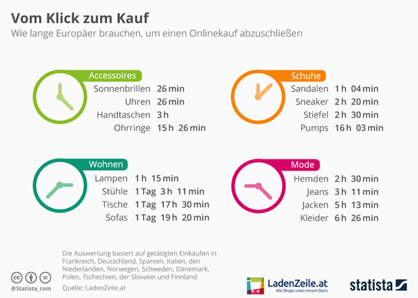 Zur besseren Visualisierung der Studienergebnisse bietet die von LadenZeile.at, in Zusammenarbeit mit Statista, erstellte Grafik einen Überblick über die Dauer, die ein europäischer Onlinekunde durchschnittlich benötigt um den Kauf abzuschließen. Zusammenfassend lässt sich sagen: Der Großteil aller Einkäufe wird europaweit innerhalb von 48 Stunden abgeschlossen. Zwischen den unterschiedlichen Produktkategorien gibt es jedoch gravierende Unterschiede. Mode und Schuhe liegen etwa im Mittelfeld, wobei man auch hier deutlich differenzieren muss: Ein einfaches T-Shirt ist beispielsweise schneller gefunden als das perfekte Kleid oder die passenden Pumps. Noch länger braucht man für den Kauf von Möbeln – naheliegend, da es sich häufig um teure Anschaffungen handelt. Accessoires hingegen sind ruckzuck gekauft: Innerhalb von 26 Minuten landen Sie im Warenkorb.
