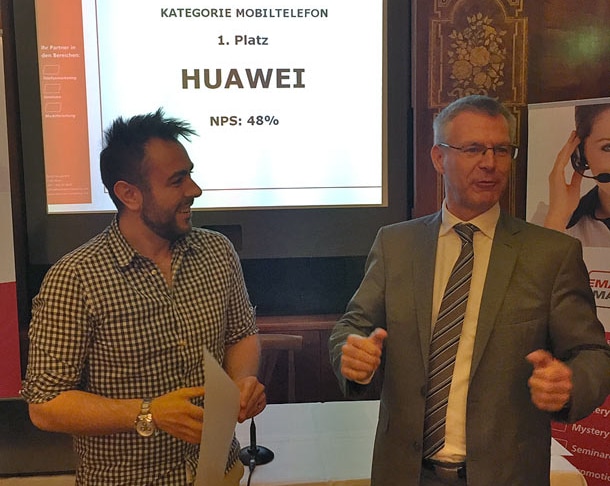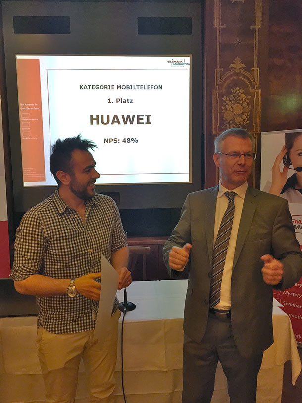 Den krönenden Abschluss bildete die Übergabe an die Preisträger: Die geringsten NPS Unterschiede innerhalb einer Branche sind in der Telekommunikationsbranche zu finden. In dieser Kategorie konnte tele.ring seine Kunden am besten überzeugen. Alice Flamant nahm als Vertreterin des T-Mobile-Konzerns die Auszeichnung entgegen. Bei den Mobiltelefonen musste sich Favorit Apple überraschend dem Marktneuling Huawei geschlagen geben. Der PR Verantwortliche von Huawei Adis Bilalic führte diesen Erfolg auf den vorbildlichen Arbeitseinsatz aller Mitarbeiter in den letzten Monaten zurück.