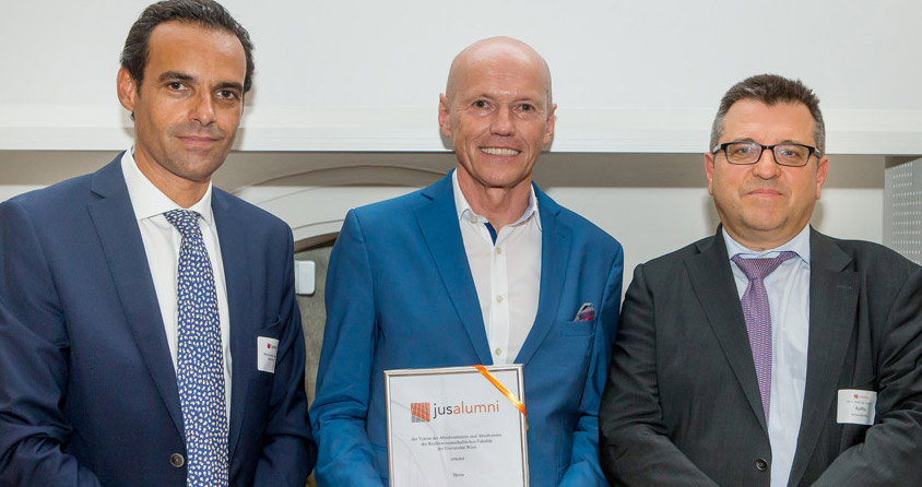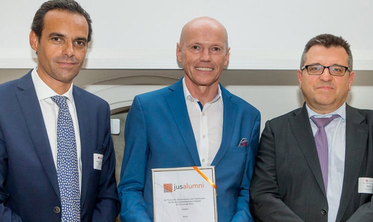 Die jus-alumni Ehrenmitgliedschaft wurde heuer zweifach vergeben: Vizedekan Friedrich Rüffler dankte in seiner Funktion als Kuratoriumspräsident von jus-alumni Peter Resetarits, u.a. verantwortlich für die Sendungen Bürgeranwalt und Schauplatz Gericht, für seine langjährige „Dolmetschertätigkeit“ für die Rechtsbranche. Selbst Doctor iuris, ist es dem Top-Journalisten ein Anliegen, komplexe Zusammenhänge allgemein verständlich zu machen und einem großen Publikum zu öffnen. Für seine Vermittlungstätigkeit an Schulen wurde das von Studenten der Rechtsfakultät der Universität Wien gegründete Legal Literacy Project (LLP) geehrt, das auch von LexisNexis tatkräftig unterstützt wird.