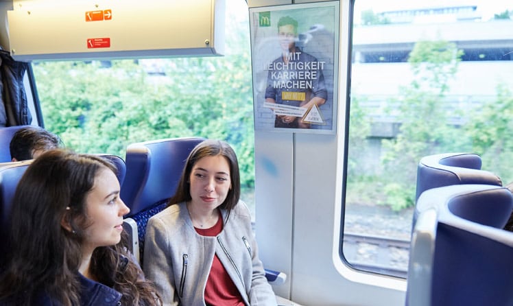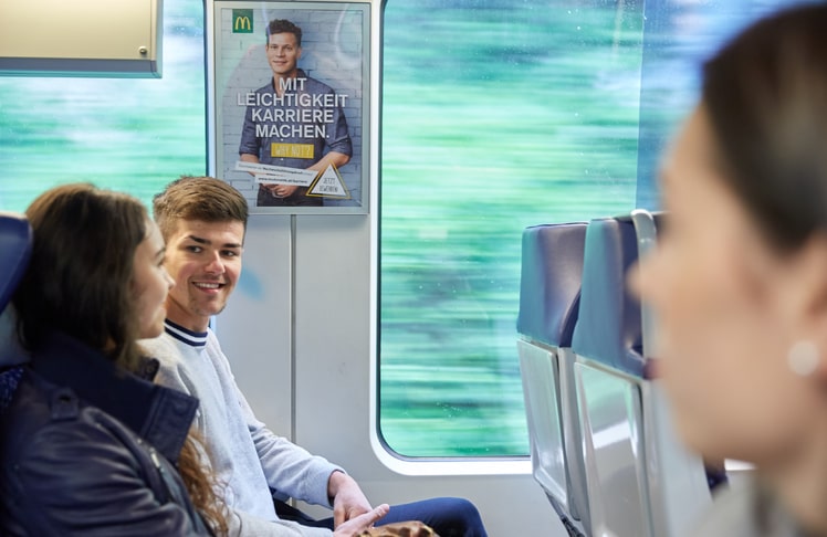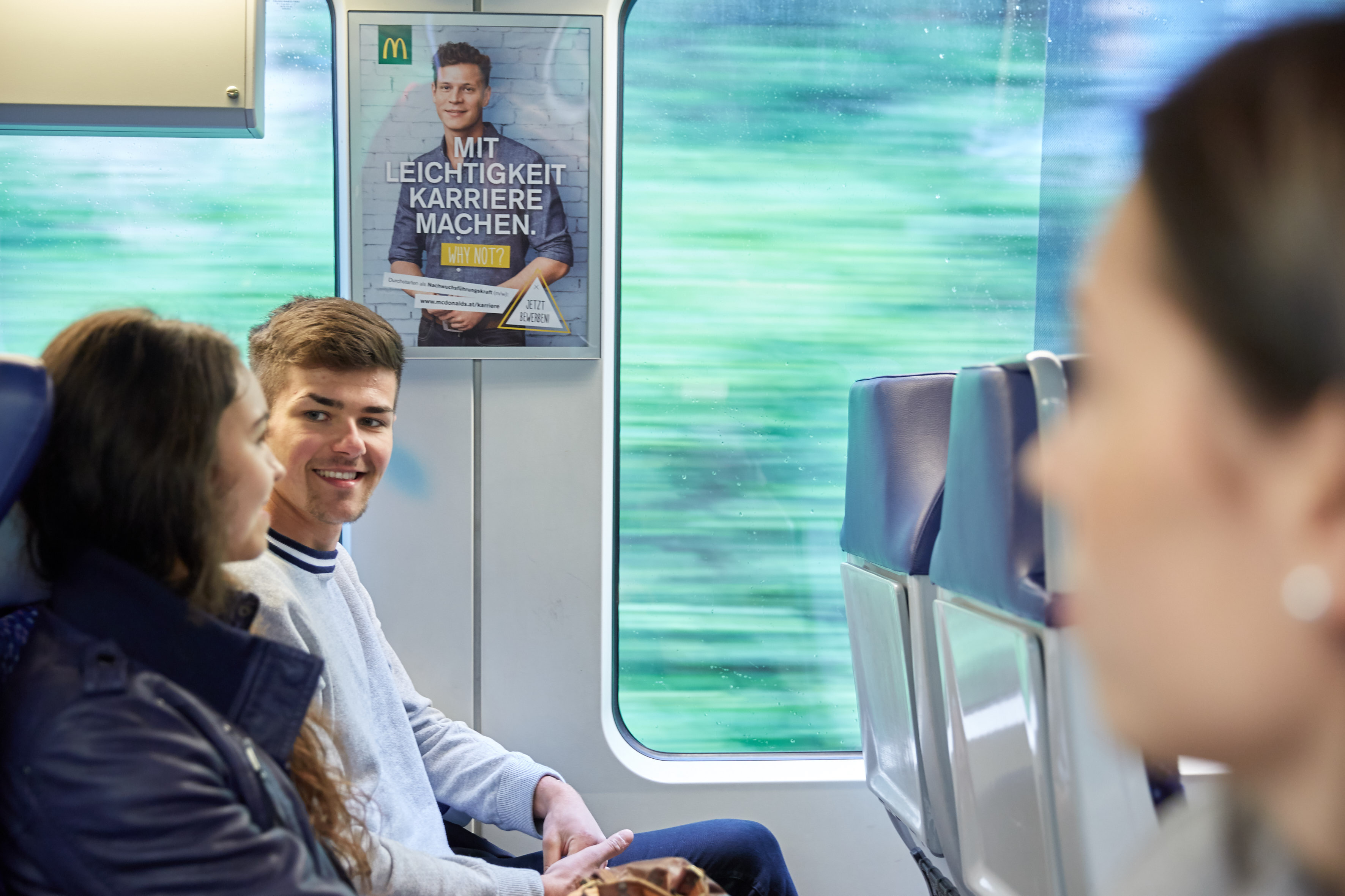 Darüber hinaus habe sich die Chance ergeben, in ungeahnte Werbe-Gefilde vorzustoßen, verrät Riegler: „Die Recruitingkampagne setzt im Wesentlichen auf Online-Maßnahmen. Ergänzend dazu wählen wir aber auch immer wieder für unsere definierten Segmente relevante Einzelmaßnahmen aus. Ein Beispiel dafür ist die ÖBB Werbung, die uns ermöglicht, in einem für uns relativ unbekannten, aber sehr spannenden Umfeld das Thema 'Arbeiten bei McDonald’s Österreich' zu platzieren.“
