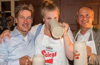 Ausgelassene Partystimmung mit frisch gezapftem Bier.