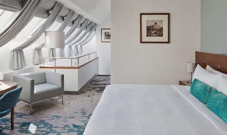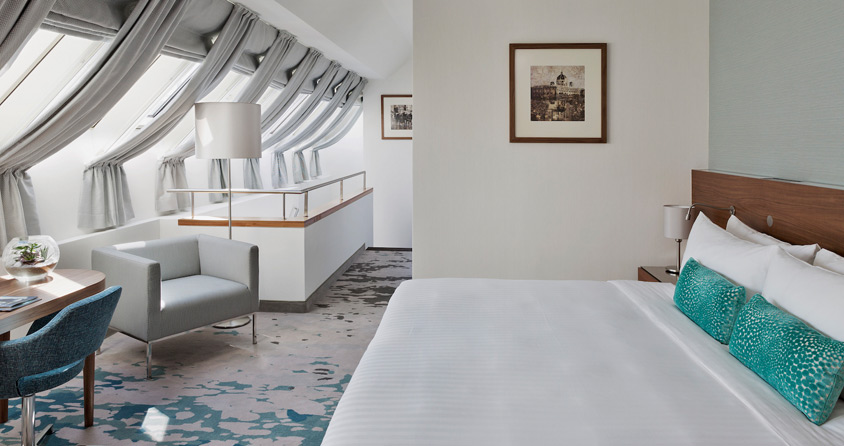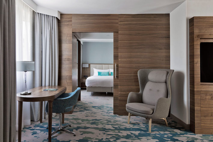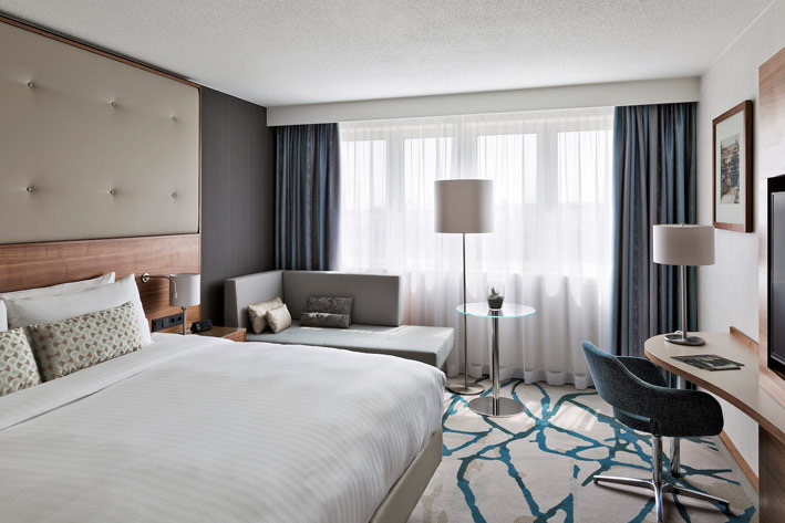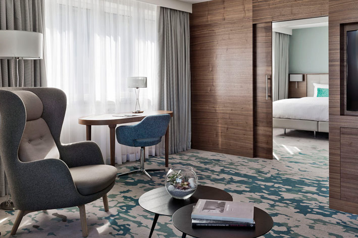 Auf Wunsch des Hauses Marriott wurde beim Umbau – übrigens dem fünften seit der Eröffnung im Jahre 1985 – höchster Wert auf perfekte Ausstattung und hochwertige Materialien gelegt. Schließlich ist ein Hotelzimmer ein emotionsgeladener Raum, der seinem Bewohner Raum zur Entfaltung geben soll. Dieter Fenz: „Neben klassischem Design geht es da vor allem um zeitgemäßes Interieur.