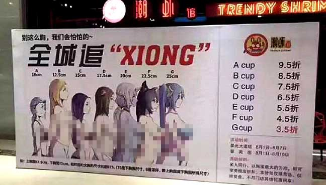 Das chinesische Restaurant "Trendy Shrimp" hat Kunden mit einer Rabattaktion verärgert, bei der die Brustgröße die Höhe des Nachlasses bestimmt. "Die ganze Stadt ist auf der Suche nach Brüsten", so der Werbeslogan der Aktion. Ein Poster im Restaurant zeigte nackte und halbnackte Anime-Figuren als Richtlinie. Körbchengröße A brachte fünf Prozent Rabatt, Größe G bereits 65 Prozent.