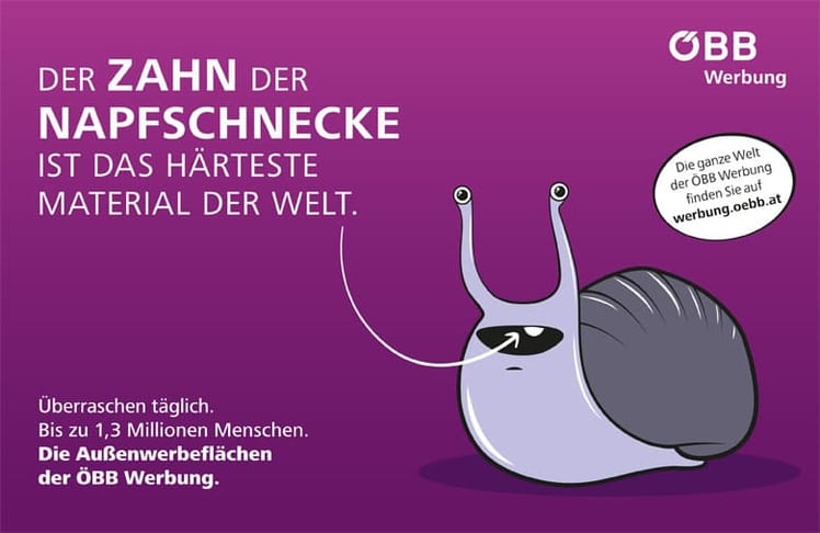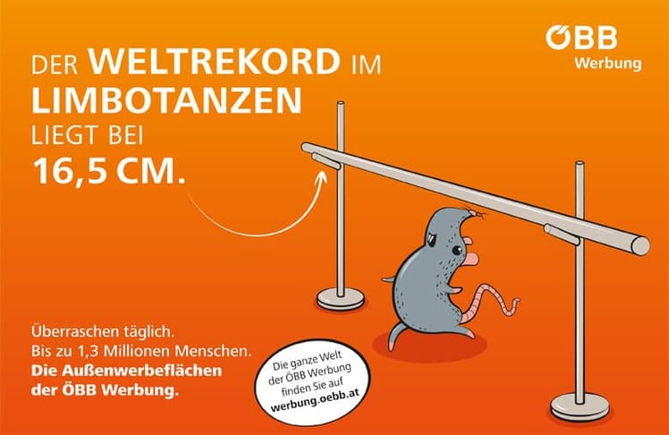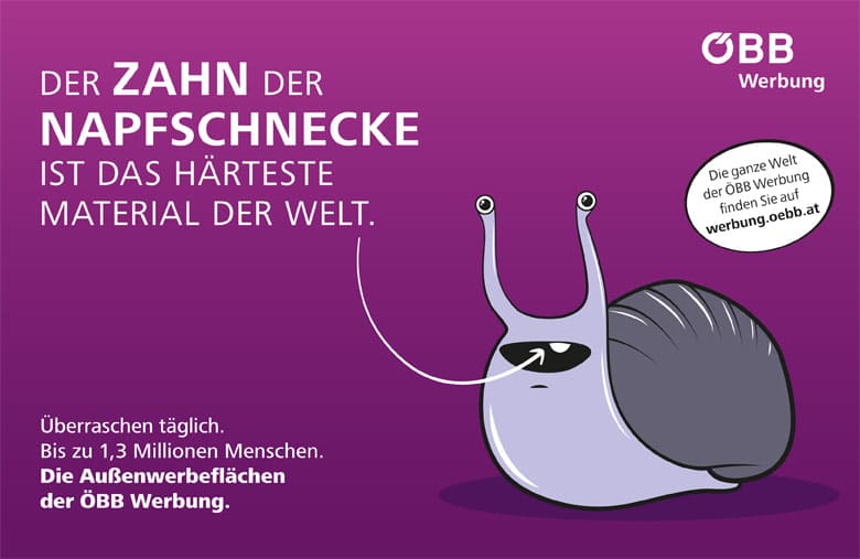 "Täglich überraschen" möchte die ÖBB Werbung mit ihrem neuen Image-Auftritt. Um das zu erreichen, hat die Außenwerbe-Unit der ÖBB eine Reihe von spannenden und durchaus schrägen Fakten hervorgekramt und sie ins Zentrum der neuen Sujets gepackt. So erfahren Werbe- und AgenturkundInnen beispielsweise, dass der Weltrekord im Limbotanzen bei äußerst knappen 16,5 cm liegt und der Zahn der Napfschnecke das härteste Material der Welt ist.