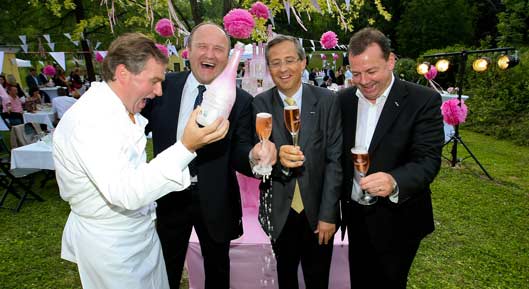 Bei der "Fête Mousseux“ in Schlumbergers rosarot dekoriertem Garten präsentierte das Wiener Unternehmen den neuen "Rosé-Secco". Zu DJ-Sounds wurden die Köstlichkeiten des Hauses an mehreren Bars ausgeschenkt. Der neue extravagante Rosé-Sekt wird ausschließlich aus Pinot Noir-Weinen aus dem Burgenland hergestellt, nach der Méthode Traditionelle in der Flasche vergoren und gerüttelt. Seine himbeerrote Farbe, die feine Perlage und das fruchtintensive, aromatische Bukett nach Himbeeren, Erdbeeren und Rosen machen ihn zu einer einzigartigen, besonders sinnlichen Gaumenfreude. Unter den Genießern gesichtet: Maria Rauch-Kallat, TV-Koch Bernie Rieder, die Haubenköche Toni Mörwald, Heinz Hanner, Martina und Karl Hohenlohe, sowie die PR- und Medienfachleute Wolfgang und Angelika Rosam und Heinz Stiastny von der ÖBB Postbus GmbH.