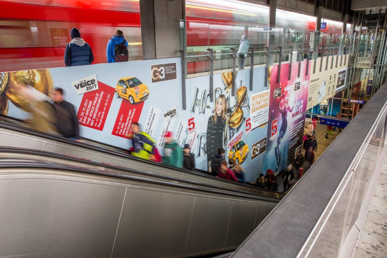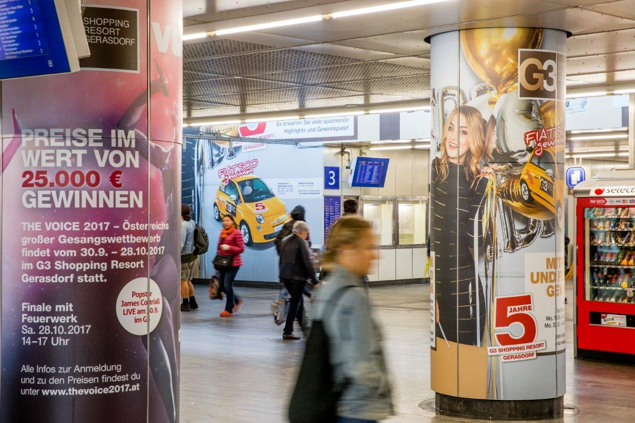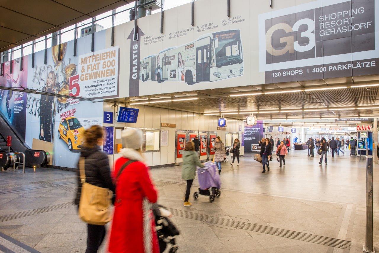 Um die Kunden auf den fünften Geburtstag und die damit verbundenen Aktionen aufmerksam zu machen, wurde auch eine umfangreiche Außenwerbekampagne gestartet. Besucher, die mit der S-Bahn kommen, werden bereits am Bahnhof Floridsdorf in Empfang genommen: Ein umfassendes Station Branding mit über 250 Quadratmeter gestalteter Fläche bringt Aufmerksamkeit bei den mehr als 30.000 Personen, die täglich am Bahnhof ankommen oder abreisen. Botschaften auf Wandflächen und Säulen informieren über den Veranstaltungskalender und weisen den Weg zum eigenen Shuttle-Bus des G3.