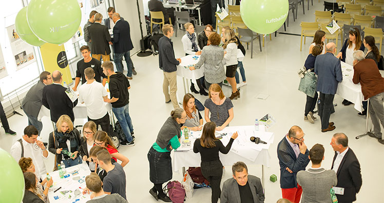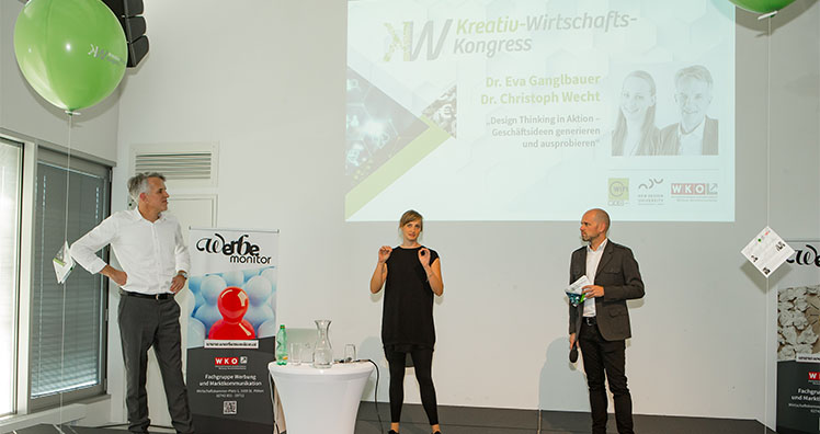Dass die New Design University St. Pölten mit ihren Ausbildungsprogrammen am Punkt ist, bewies der Vortrag „Design Thinking in Aktion – Geschäftsideen generieren und ausprobieren“. Die beiden NDU-Professoren, Eva Ganglbauer und Christoph Wecht, spannten den Bogen von „Design Thinking“, über kreative, handlungs- und lösungsorientierte Strategien bis hin zur Entwicklung von neuen Ideen.