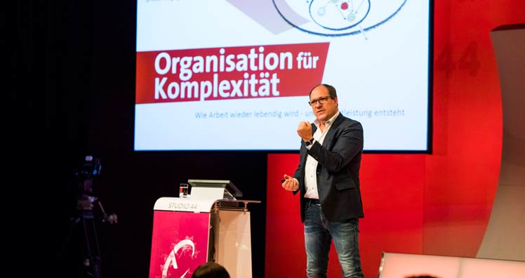 Niels Pfläging, etablierter "Management-Exorzist" im deutschsprachigen Raum, trieb bei seiner Keynote so manchem Anwesenden mit seinen Thesen das große Staunen ins Gesicht. "Die Sozialtechnologie 'Management' ist ein Zombie aus dem Industriezeitalter und so wie wir sie kennen – mit reichlich Planung, hierarchischer Steuerung und funktionaler Teilung – ist sie für komplizierte Wertschöpfung mit geringer Komplexität und Dynamik geeignet", so Pfläging bei seinem Vortrag. Doch heute seien wir mit dem genauen Gegenteil konfrontiert. Hohe Komplexität und Dynamik kombiniert mit Management von anno dazumal führen zum Kollaps von Unternehmen. Seine Kernbotschaft: "Wir haben keine Wahl und müssen uns auf die Agilität einstellen. Bilden Sie Teams, kleine Mini-Unternehmen im Unternehmen, und vernetzen Sie diese."