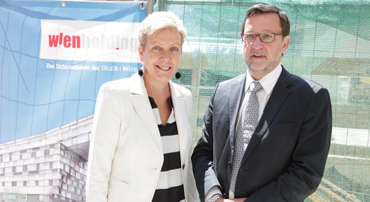 Bei der Dachgleiche unter anderem dabei Finanz- und Wirtschaftsstadträtin Vizebürgermeisterin Renate Brauner, Wien Holding Geschäftsführerin Sigrid Oblak, Christian Feuchter - Gebietsbauleiter der Swietelsky Baugesellschaft, sowie Robert Pschirer - Bezirksvorsteher-Stellvertreter des 14. Bezirks.