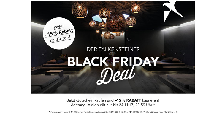 Die Aktion beginnt am Donnerstag (23. November) um 19 Uhr und endet am Freitag exakt um 23:59. Wer in diesem Zeitraum auf https://blackfriday.falkensteiner.com Falkensteiner Geschenkgutscheine ordert und nach der Auswahl von Gutscheindesign und Grußbotschaft als Aktionscode „Blackfriday17“ einträgt, wird automatisch Nutznießer des „Falkensteiner Black Friday Deals“ – und bekommt um 15 Prozent weniger verrechnet.