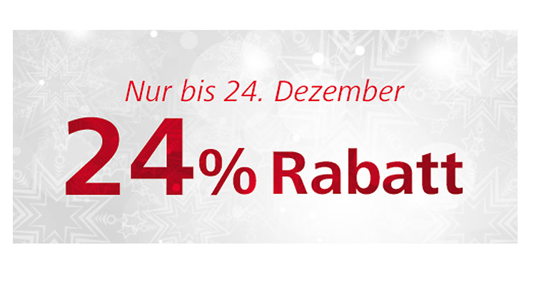 Rabatt wird automatisch bei jeder Bestellung abgezogen und ist auf der Rechnung separat ersichtlich. Aktion gültig von 1.12.2017-24.12.2017 für Kunden und ÖBB-Mitarbeiter, ausgenommen sind Firmenkunden und ÖBB-Teilkonzerne. Rabatt gültig auf das gesamte Sortiment solange der Vorrat reicht, ausgenommen sind Produkte der RCG.