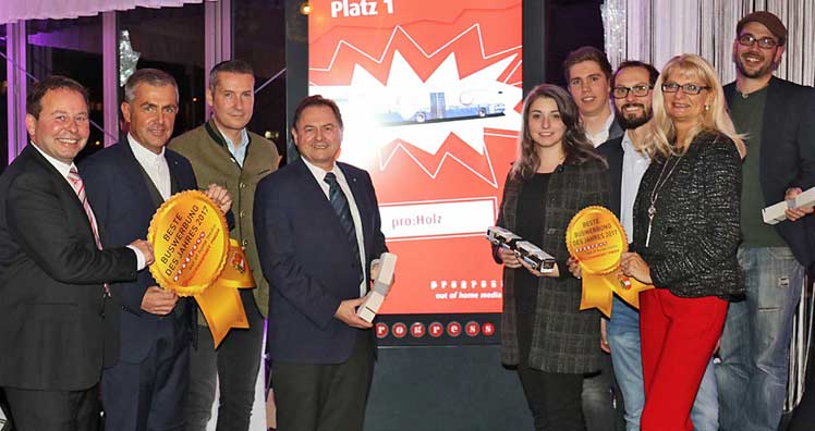 Die Progress Werbung hat im Rahmen seines Winterfestes wieder die Salzburger "Busse des Jahres" gekürt. Gewählt wurden die Gewinner vom Publikum. Den Preis als bester Bus des Jahres durfte sich proHolz für seine "holzistgenial"-Kampagne abholen. "Um der städtischen Bevölkerung die Bedeutung der Verwendung von Holz als Werk- und Baustoff sichtbar zu machen, haben wir uns für eine Transport Media-Kampagne entschieden", so Rudolf Rosenstatter, Obmann von proHolz Salzburg, der sich naturgemäß über die Auszeichnung freut, ebenso wie Thomas Zezula von der Aacademy Agency: "Es gibt nichts schöneres, als für Nachhaltigkeit kreativ zu sein."