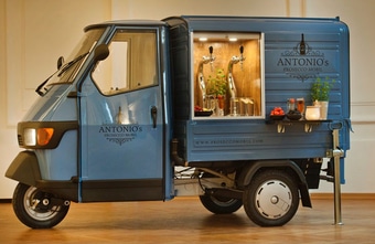 Antonios Prosecco Mobil ist eine Original 3rad Piaggio Ape, welche mit viel Liebe zum Detail in eine mobile Schaumwein-Bar umgebaut wurde. Prickelnder Prosecco frisch gezapft aus dem Fass.