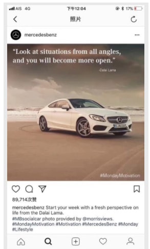 "Betrachte die Lage von allen Seiten, und Du wirst offener werden", ist auf einem von Daimler geposteten Instagram-Foto unter dem Hashtag "Monday Motivation" mit einem weißen Mercedes-Coupé zu lesen. Der Dalai Lama ist jedoch eine Hassfigur für die chinesische Regierung - vor allem da er sich für die Unabhängigkeit Tibets einsetzt.