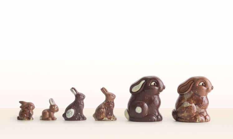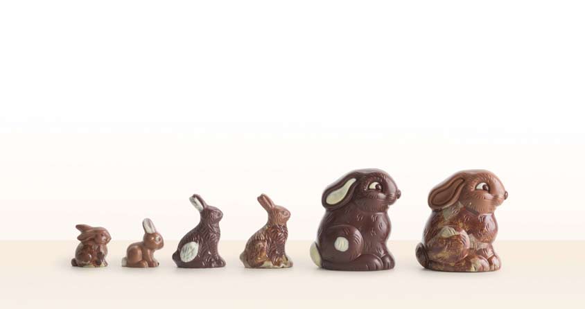 Edel, bitter und kräftig zeigt sich die zarte Edelbitter-Schokoladentafel mit 70 Prozent Kakaoanteil, die herbe Schokoladenhülle birgt eine kräftige Espresso-Creme mit aromatischer Mandelnote. Hoppelhasen aus Handarbeit: Die große Schokoladenhasen-Familie wird jedes Ostern raffiniert und liebevoll veredelt, vom Schokohasen mit feinen Frucht- oder Keksstückchen über Feldhasen im bunt gesprenkelten Schokoladenkleid bis zu mit Nougat gefüllte Mini-Häschen, ist auch dieses Jahr jedes Stück ein kleines Unikat.