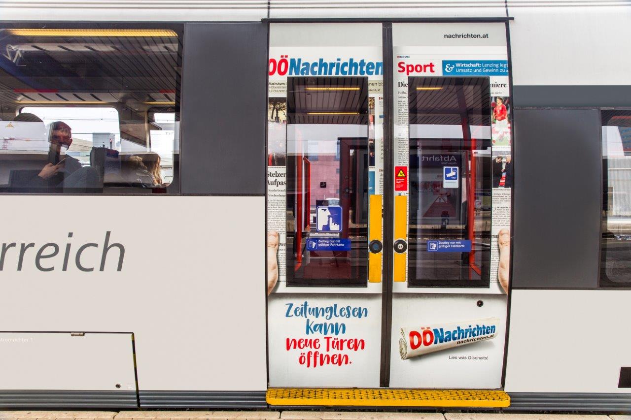 Mit einer regionalen Werbekampagne laden aktuell die OÖN potentielle Leser ein, ihren Horizont zu erweitern. Mit dem Kampagnen-Slogan "Zeitunglesen kann neue Türen öffnen" weisen die OÖN direkt auf den Eingangstüren der Schnellbahnen in Oberösterreich auf ihr Nachrichten-Angebot hin.
